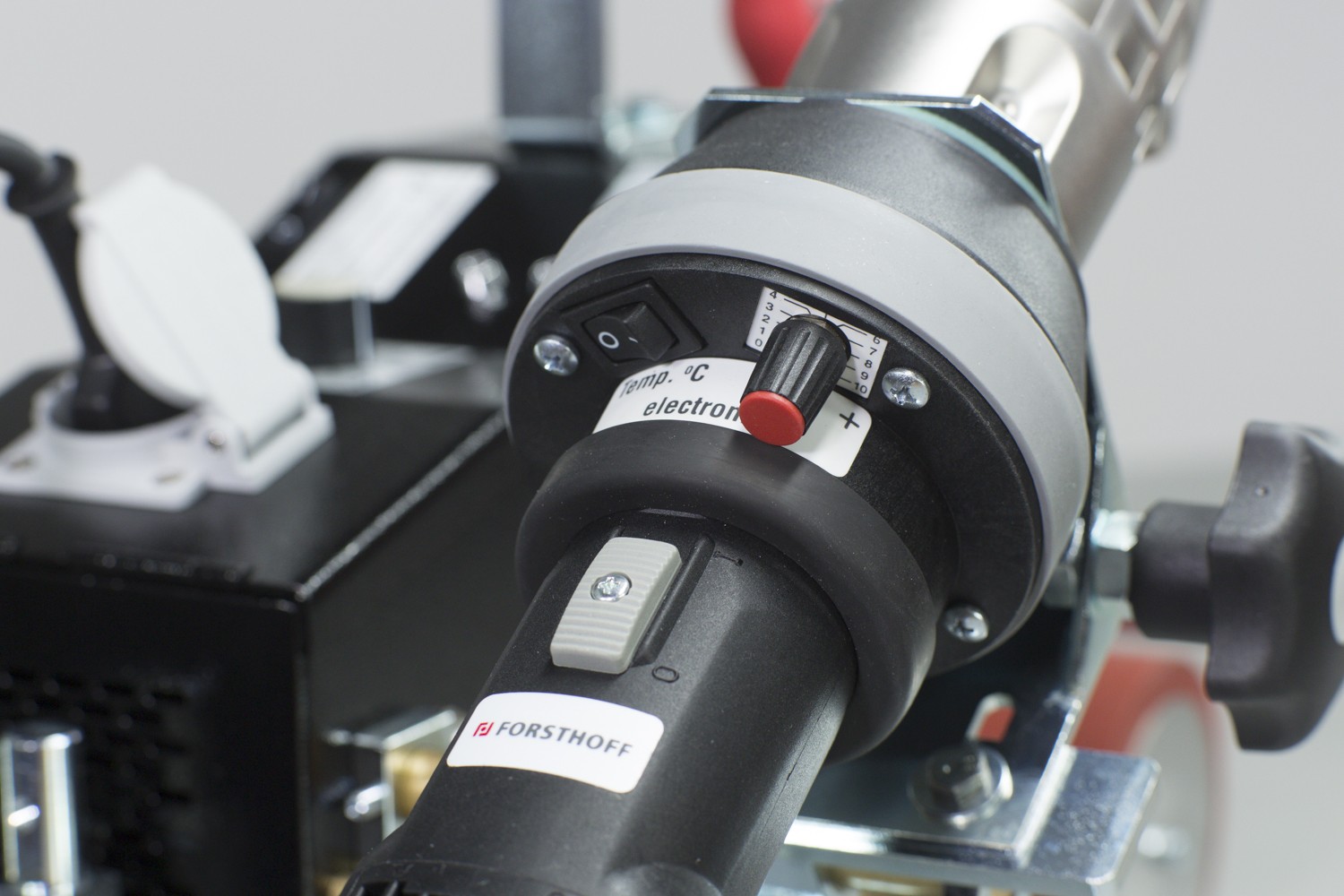 Die Heizleistung von bis zu 4000 W (230 V AC) ist stufenlos von 20 bis 700 °C einstellbar und kann somit individuell an unterschiedliche Materialien angepasst werden. Nachdem der Schweißkopf in Position gedreht wurde, startet der FORSTHOFF-P2 automatisch. Darüber hinaus sorgt die stufenlose Geschwindigkeitsregelung der fortschrittlichen Motorengeneration mit einer Laufgeschwindigkeit von bis zu 18 Metern/min in Kombination mit der Spannvorrichtung für faltenfreies Schweißen und damit für optimale Schweißergebnisse. Ein sicheres Drei-Punkt-Auflage-System sorgt zudem für einen festen Druck auf das Segel.