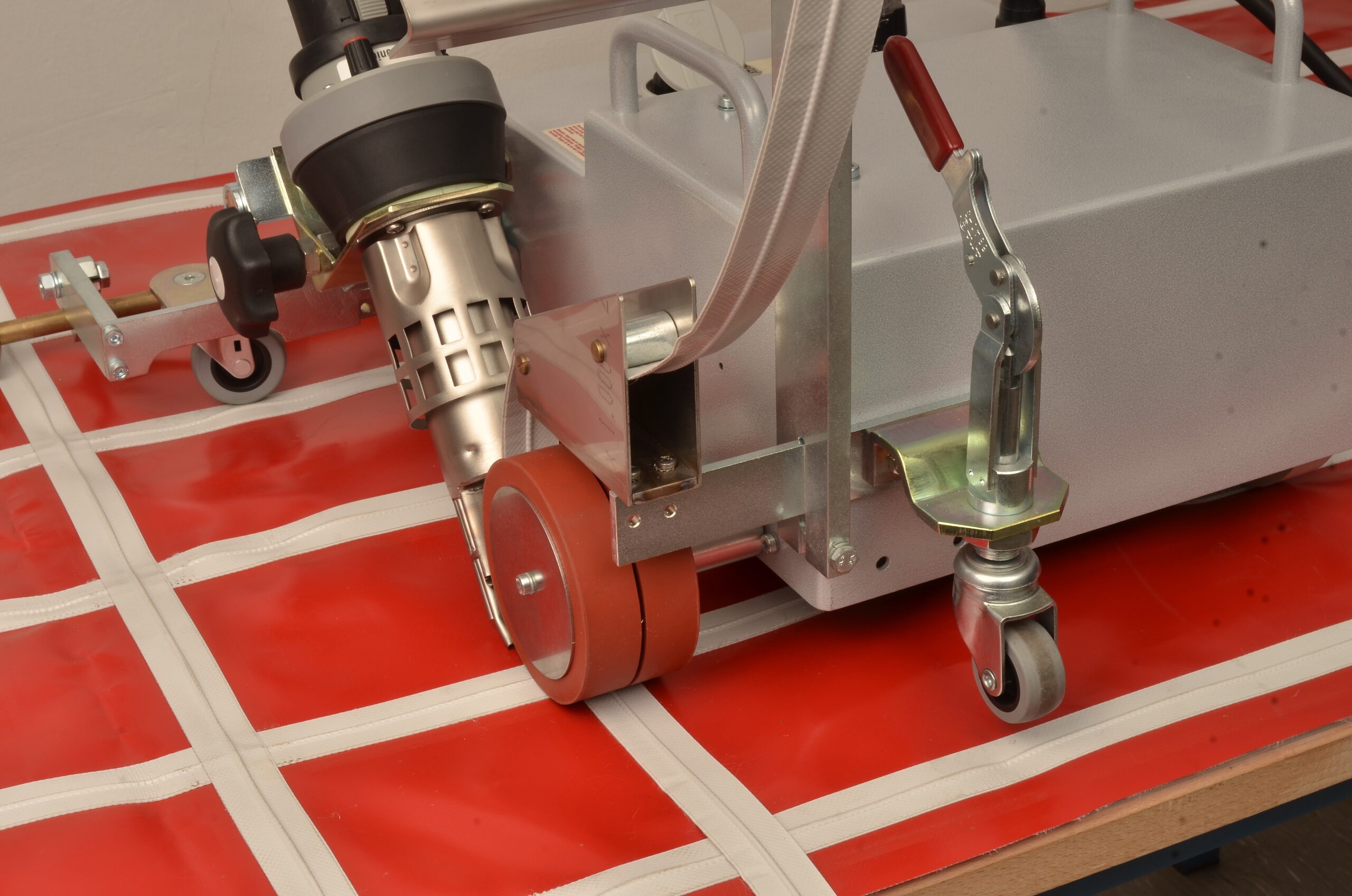 The hot-air welding unit has a heating power of 4000 W (230 V AC), which is infinitely adjustable from 20 to 700 °C. The drive unit is equipped with a powerful motor and a robust housing, ensuring fast operation and high pressure. The unit starts automatically after the welding head is rotated into position.